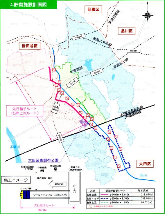 今回始まるのは呑川に流れ込む世田谷区、目黒区、大田区の下水区域のうち、大田区の下水のみが対象ですが、それでも完成すれば全体の約1/3超の下水の流れ込みを概ね防ぐことが可能になる工事です。方法は図-1の様に大田区の東調布公園を起点とした直径3mから2.4mのトンネルを道路下に延長距離で約6km超にわたり造り、雨天時はそこに雨交じりの下水を貯めて従来は川に溢れさせていた初期下水の汚物を回収防止する装置になります。 本格的な雨の多くは従来通り川に流すことになりますが、雨の降り始めの汚物を多く含む下水を回収して一旦貯め、雨が止んだら、下水道本管経由「森ケ崎水再生センター」へ送り、処理後、海へ捨てるフローとなります。下水道局によれば、概ね7割(降雨回数で)の雨天時下水の流入を防止できるとのことで、大いに期待すべき対策が始まると考えてよいでしょう。ただ、問題はこの工事が終了するのに概ね10年以上かかるとのことです。また、さらに完成しても全体必要部分の約1/3超のみである点は大いに留意すべきことであり、今後も大田区や東京都下水道局にさらなる尽力を願わなければならない次第です。以上 (文責:H・K)