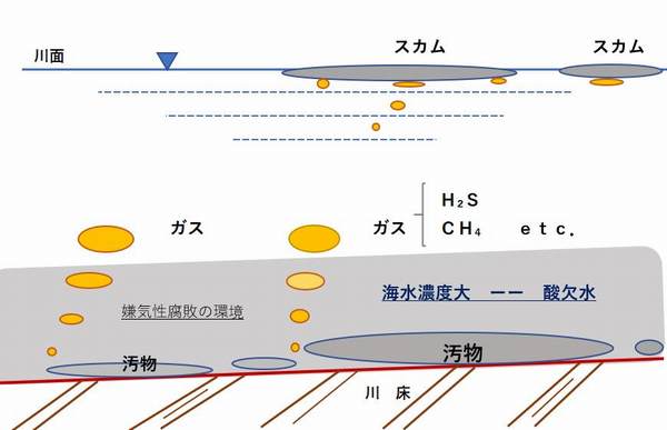 図-2 汚物の腐敗とスカムの浮遊模式図