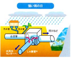 呑川の周辺の下水道の方式は「合流式」と言って、降雨時は雨水を下水管に流して処理する方式になっています。